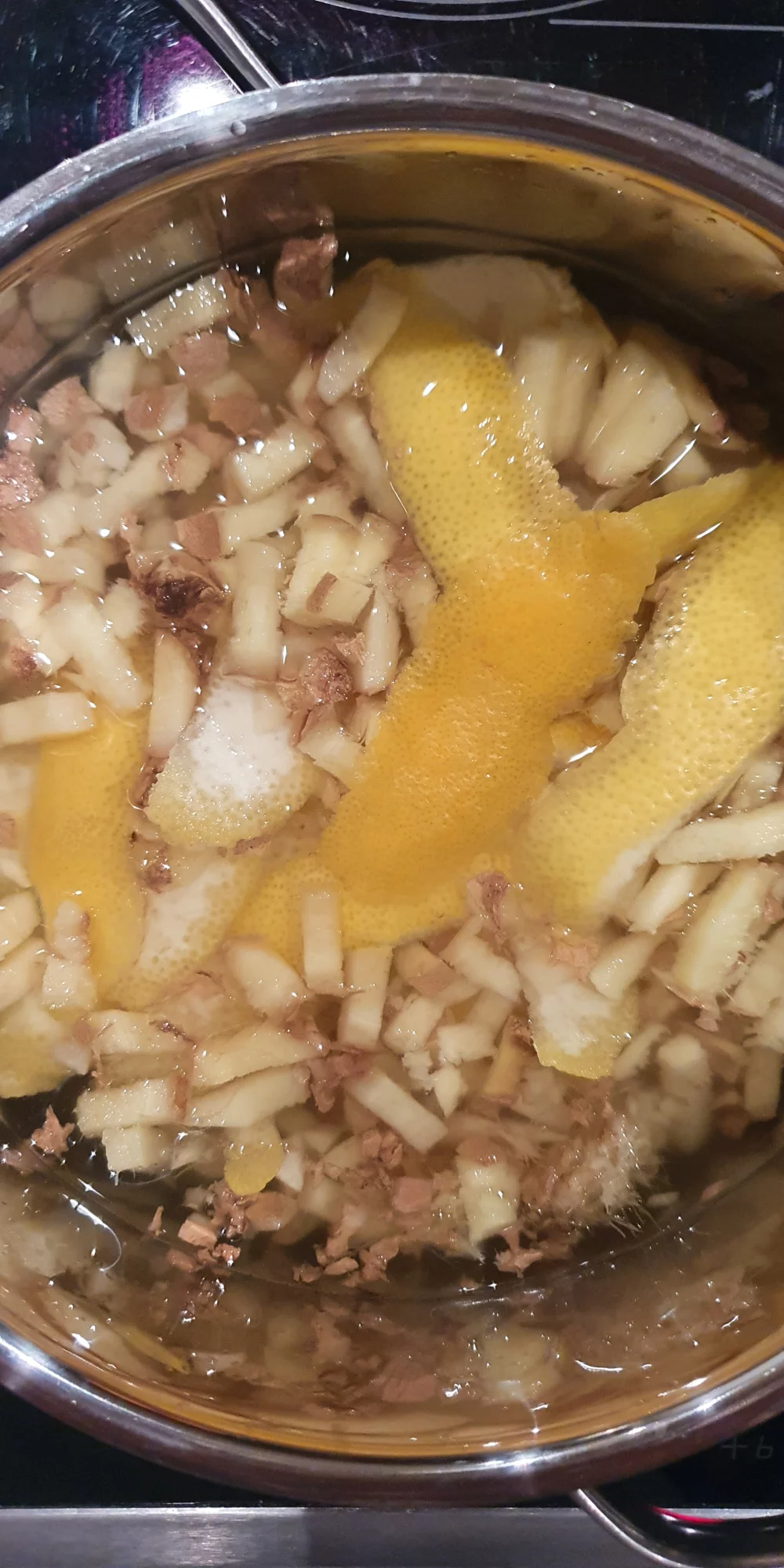 - Place the ginger pieces and lemon zest in a pot with 700 ml of water and simmer over low heat for about 20 minutes.