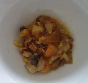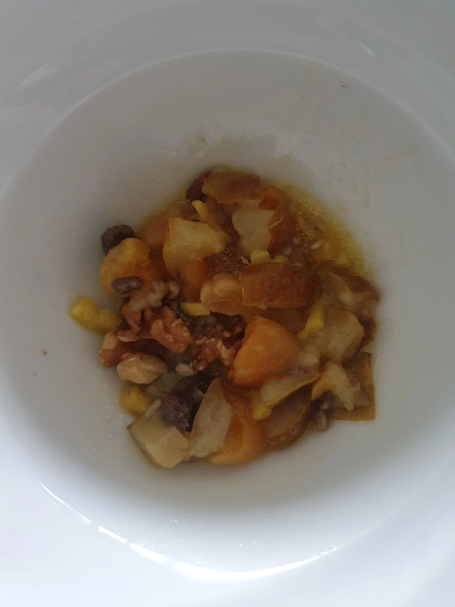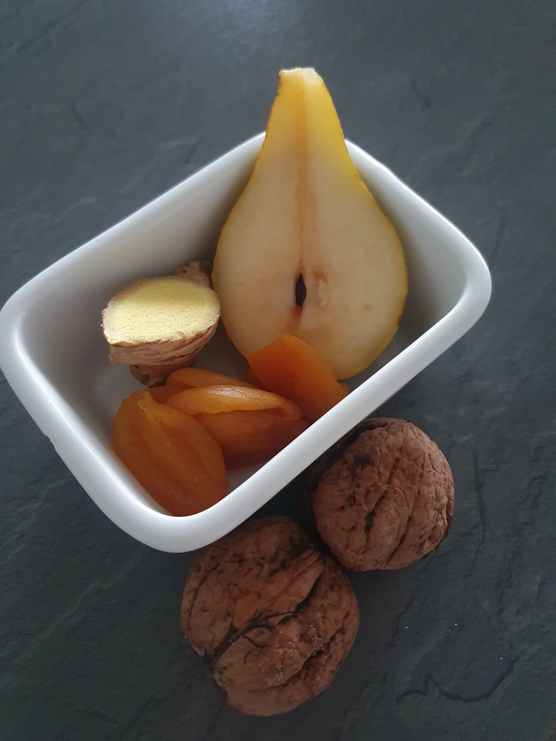 Alles klein schneiden und auf kleiner Stufe warm werden lassen, bis die Birne Saft abgibt. Abschmecken und lauwarm genießen.
