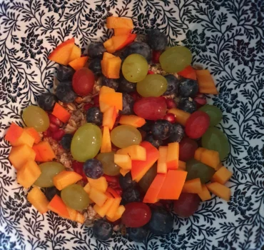 Schneide das Obst (Kaki, Heidelbeeren, Granatapfel) und gebe es in eine Schüssel.