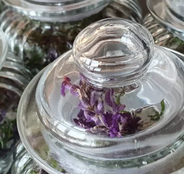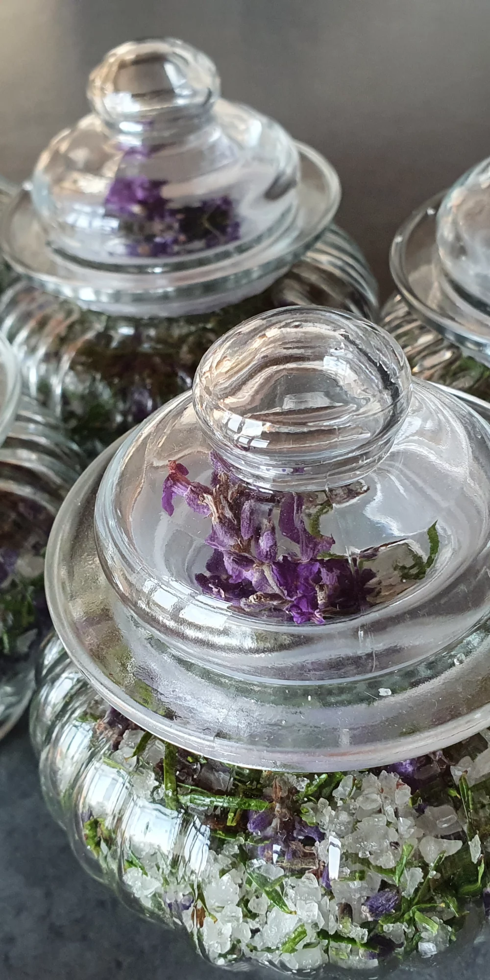 Schichte die Lavendelblüten, Nadeln und Salz abwechselnd im Glasgefäß und drücke jede Schicht vorsichtig an.