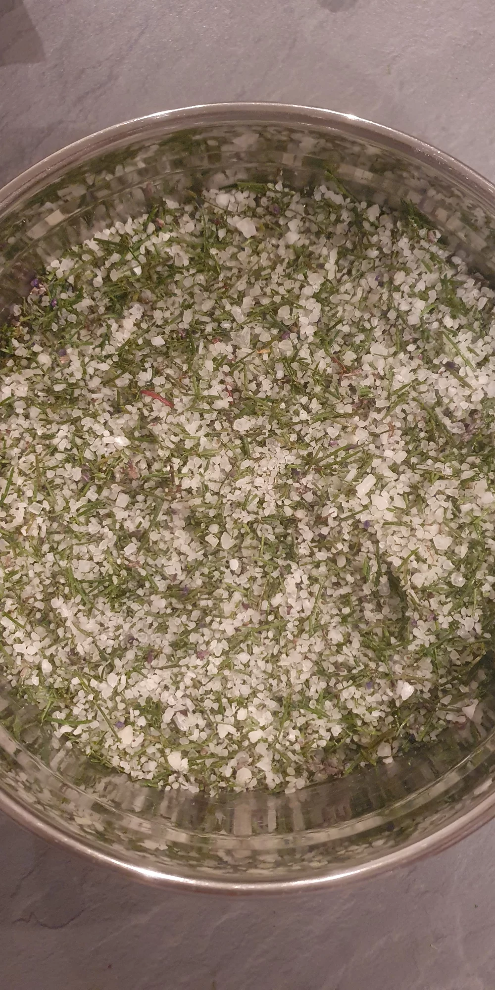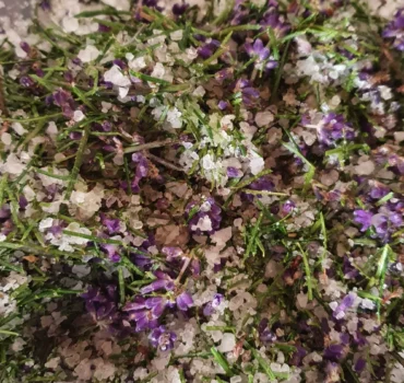 Sobald das Glas gefüllt ist, verschließe es und lasse es für 2 Wochen an einem dunklen Ort ziehen, damit das Salz die aromatischen Öle der Nadeln und Blumen aufnehmen kann. (Alternativ kannst du die Nadeln direkt mit dem Salz vermischen.)